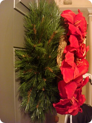 The wreath is a basic (fake) evergreen with the beautiful amaryllis wreath from Target wired on top:
