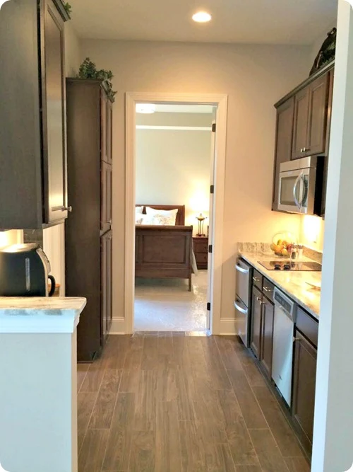 The cabinetry was a beautiful dark gray. It reminded me of my Peppercorn bedroom wall: