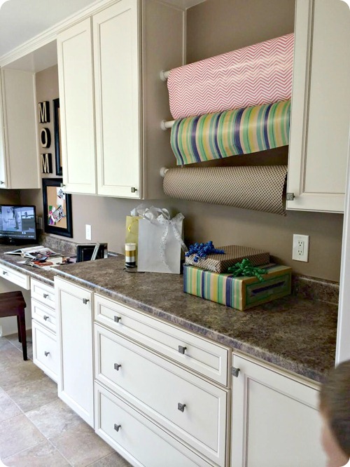 The mom room upstairs (funny how they are usually paired with the laundry) was a great space with simple rods between the cabinets for wrapping paper: