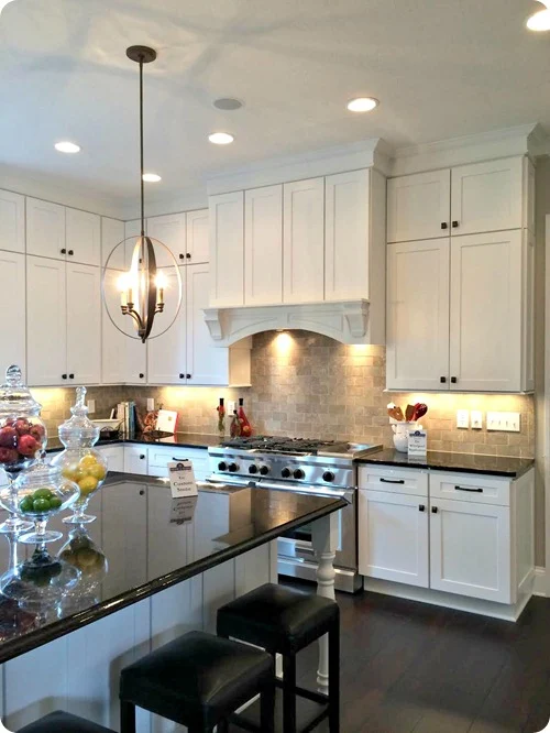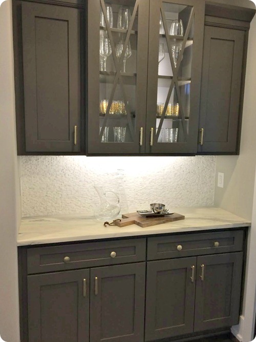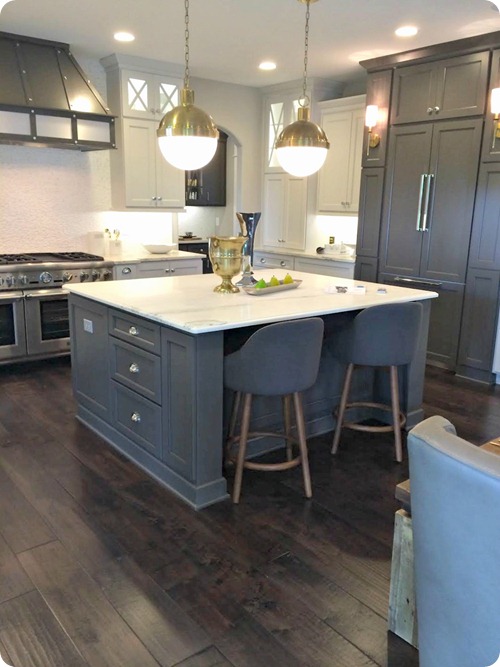 I’m totally in to the two tone cabinets lately and these looked so classic and pretty to me. The gray was just on the taller cabinets to the side and the large island but it really gave some nice contrast. I find I’m liking this look better than an all white kitchen.